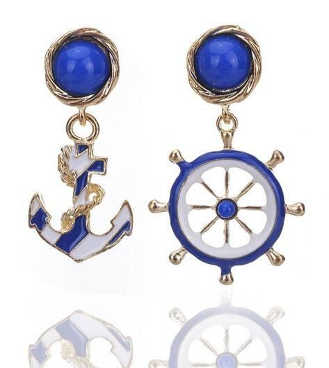 マリン柄の(碇と船舵)のピアスになります。 (ブルー & ホワイト & ゴールド カラー)
